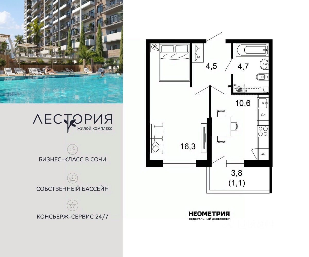 Продается квартира в жилом комплексе бизнес-класса "Лестория". В составе ЖК предусмотрена собственная аквазона площадью 473 квадратных метра с двумя подогреваемыми бассейнами, что соответствуют стандартам бизнес-класса. Аквазона объединяет взрослый и детский бассейны. В welcome-zone к услугам посетителей шезлонги и все необходимые принадлежности. Раздевалки с душевыми комнатами, инфракрасная сауна — здесь все предусмотрено для комфортного отдыха и полного расслабления. Для водного комплекса продуман отдельный вход, оборудованный системой контроля и управления доступом (СКУД). Аквазона только часть уникальной инфраструктуры "Лестории", которая включает в себя также благоустроенную территорию с пятьюдесятью функциональными зонами для прогулок, отдыха и занятий спортом, видовые террасы на крышах для отдыха, работы и встреч с друзьями, а также пространство набережной Кудепсты с шезлонгами и перголами. Жилой комплекс "Лестория" состоит из шести домов высотностью от 15 до 17 этажей, окружённых зеленым массивом национального парка. На придомовой территории для жителей предусмотрены закрытые дворы с круглосуточным видеонаблюдением, активити-центр для детей и подростков, тихие зоны для отдыха и медитации. На крышах домов будут созданы зеленые террасы для наслаждения прекрасными видами на море и горы. В проекте предусмотрены разные варианты отделки квартир под потребности покупателей. Тем, кто хочет воплотить в жизнь собственные интерьерные задумки, подойдут квартиры без ремонта. Для комфортной жизни и отдыха в комплексе будет работать круглосуточный консьерж-сервис уровня 5*, который с легкостью закроет все ежедневные потребности: от заказа продуктов и встречи гостей в аэропорту до выгула и дрессировки питомца. К услугам жителей ЖК "Лестория" — собственная управляющая компания, для инвесторов предоставляются услуги доверительного управления.