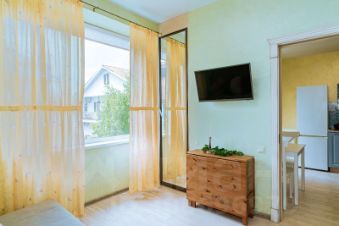 В новом доме (с лифтом), в центре города, при этом в спокойном спальном районе и в пяти минутах от эпицентра всех событий города, с самым удачным местоположением в центре Адлера.