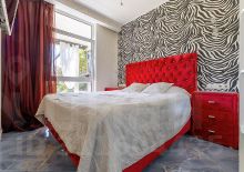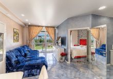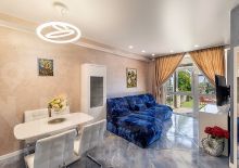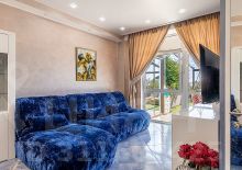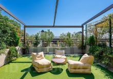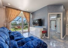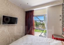 Просторная спальня с витражным окном, открывающим вид на террасу, выделенная комната под гардеробную, санузел с душевой кабиной. Кухня, соединенная с гостиной, оборудованная выходом на открытую террасу с автоматическим навесом. Главным преимуществом этой квартиры является большая зеленая терраса с патио и частичным видом на море.