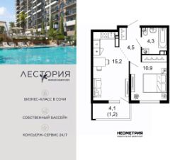 Продается квартира в жилом комплексе бизнес-класса "Лестория". В составе ЖК предусмотрена собственная аквазона площадью 473 квадратных метра с двумя подогреваемыми бассейнами, что соответствуют стандартам бизнес-класса. Аквазона объединяет взрослый и детский бассейны. В welcome-zone к услугам посетителей шезлонги и все необходимые принадлежности. Раздевалки с душевыми комнатами, инфракрасная сауна — здесь все предусмотрено для комфортного отдыха и полного расслабления. Для водного комплекса продуман отдельный вход, оборудованный системой контроля и управления доступом (СКУД). Аквазона только часть уникальной инфраструктуры "Лестории", которая включает в себя также благоустроенную территорию с пятьюдесятью функциональными зонами для прогулок, отдыха и занятий спортом, видовые террасы на крышах для отдыха, работы и встреч с друзьями, а также пространство набережной Кудепсты с шезлонгами и перголами. Жилой комплекс "Лестория" состоит из шести домов высотностью от 15 до 17 этажей, окружённых зеленым массивом национального парка. На придомовой территории для жителей предусмотрены закрытые дворы с круглосуточным видеонаблюдением, активити-центр для детей и подростков, тихие зоны для отдыха и медитации. На крышах домов будут созданы зеленые террасы для наслаждения прекрасными видами на море и горы. В проекте предусмотрены разные варианты отделки квартир под потребности покупателей. Тем, кто хочет воплотить в жизнь собственные интерьерные задумки, подойдут квартиры без ремонта. Для комфортной жизни и отдыха в комплексе будет работать круглосуточный консьерж-сервис уровня 5*, который с легкостью закроет все ежедневные потребности: от заказа продуктов и встречи гостей в аэропорту до выгула и дрессировки питомца. К услугам жителей ЖК "Лестория" — собственная управляющая компания, для инвесторов предоставляются услуги доверительного управления.