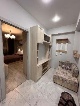 В квартире есть балкон-лоджия, где удобно расположится с чашечкой кофе, любуясь закатом на море. Вход на лоджию со спальни и с кухни.