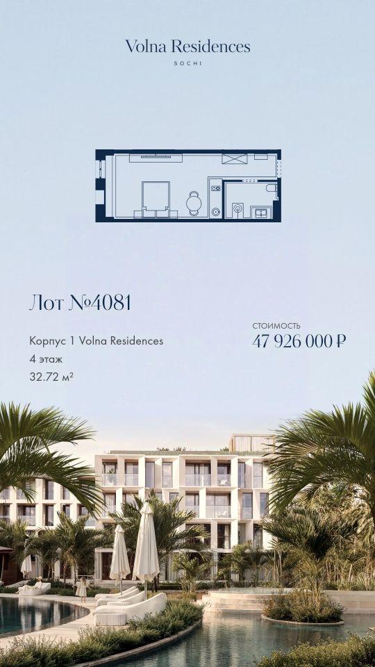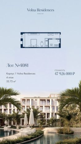 Продаётся 1-комнатная квартира в строящемся доме (Дом 1 ), срок сдачи: II-кв. 2028, общей площадью 32.72 кв.м., на 4 этаже. Volna Residence - это комплекс для жизни на территории комплекса Volna, объединённый с отелем общей концепцией и инфраструктурой. 3 малоэтажных корпуса на 520 номеров расположены на первой береговой линии и имеют собственный бассейн.