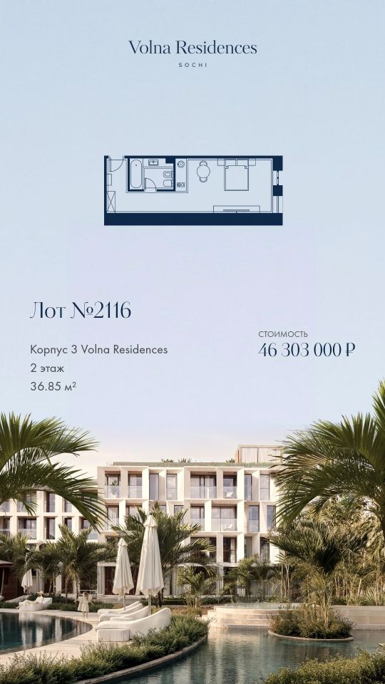 Продаётся 1-комнатная квартира в строящемся доме (Дом 3), срок сдачи: II-кв. 2028, общей площадью 36.85 кв.м., на 2 этаже. Volna Residence - это комплекс для жизни на территории комплекса Volna, объединённый с отелем общей концепцией и инфраструктурой. 3 малоэтажных корпуса на 520 номеров расположены на первой береговой линии и имеют собственный бассейн.