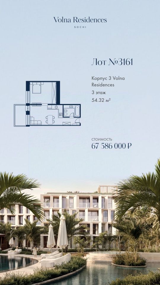 Продаётся 1-комнатная квартира в строящемся доме (Дом 3), срок сдачи: II-кв. 2028, общей площадью 54.32 кв.м., на 3 этаже. Volna Residence - это комплекс для жизни на территории комплекса Volna, объединённый с отелем общей концепцией и инфраструктурой. 3 малоэтажных корпуса на 520 номеров расположены на первой береговой линии и имеют собственный бассейн.