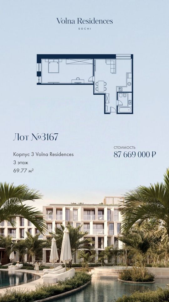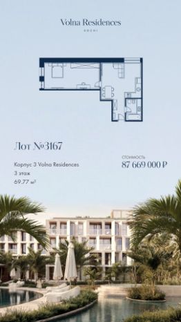 Продаётся 1-комнатная квартира в строящемся доме (Дом 3), срок сдачи: II-кв. 2028, общей площадью 69.77 кв.м., на 3 этаже. Volna Residence - это комплекс для жизни на территории комплекса Volna, объединённый с отелем общей концепцией и инфраструктурой. 3 малоэтажных корпуса на 520 номеров расположены на первой береговой линии и имеют собственный бассейн.