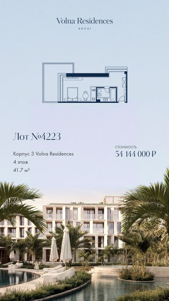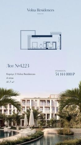 Продаётся 1-комнатная квартира в строящемся доме (Дом 3), срок сдачи: II-кв. 2028, общей площадью 41.7 кв.м., на 4 этаже. Volna Residence - это комплекс для жизни на территории комплекса Volna, объединённый с отелем общей концепцией и инфраструктурой. 3 малоэтажных корпуса на 520 номеров расположены на первой береговой линии и имеют собственный бассейн.