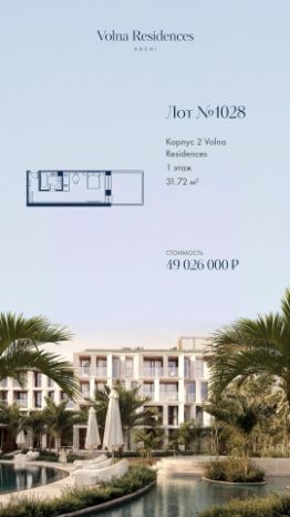 Продаётся 1-комнатная квартира в строящемся доме (Дом 2), срок сдачи: II-кв. 2028, общей площадью 31.72 кв.м., на 1 этаже. Volna Residence - это комплекс для жизни на территории комплекса Volna, объединённый с отелем общей концепцией и инфраструктурой. 3 малоэтажных корпуса на 520 номеров расположены на первой береговой линии и имеют собственный бассейн.