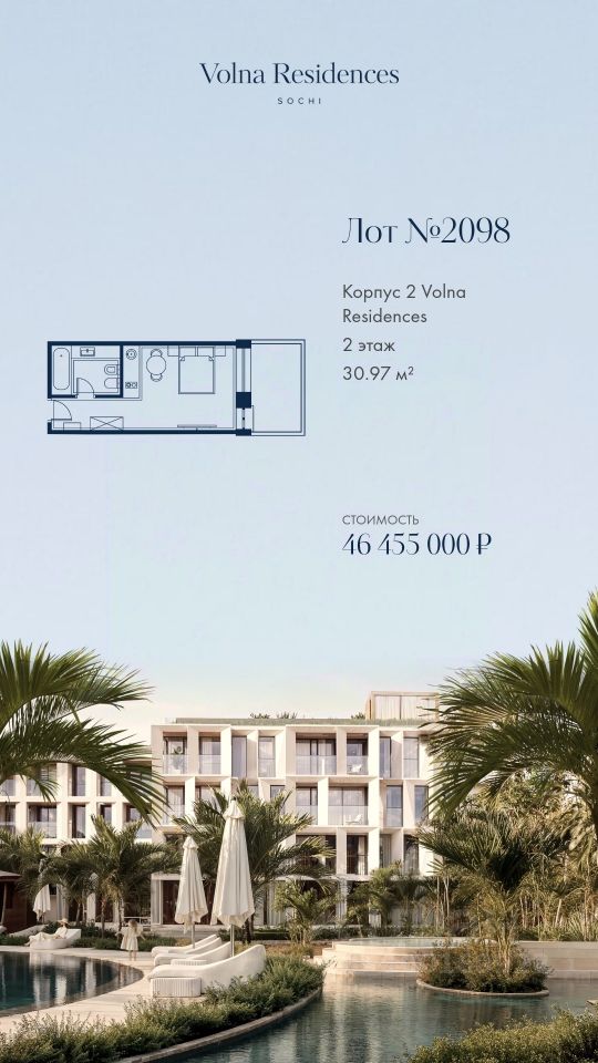 Продаётся 1-комнатная квартира в строящемся доме (Дом 2), срок сдачи: II-кв. 2028, общей площадью 30.97 кв.м., на 2 этаже. Volna Residence - это комплекс для жизни на территории комплекса Volna, объединённый с отелем общей концепцией и инфраструктурой. 3 малоэтажных корпуса на 520 номеров расположены на первой береговой линии и имеют собственный бассейн.