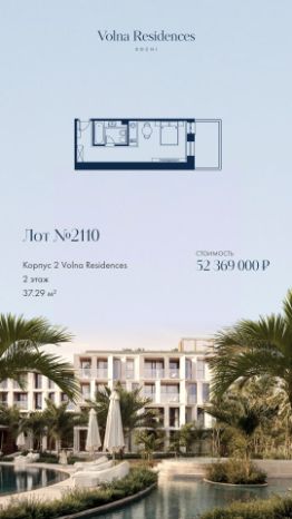 Продаётся 1-комнатная квартира в строящемся доме (Дом 2), срок сдачи: II-кв. 2028, общей площадью 37.29 кв.м., на 2 этаже. Volna Residence - это комплекс для жизни на территории комплекса Volna, объединённый с отелем общей концепцией и инфраструктурой. 3 малоэтажных корпуса на 520 номеров расположены на первой береговой линии и имеют собственный бассейн.
