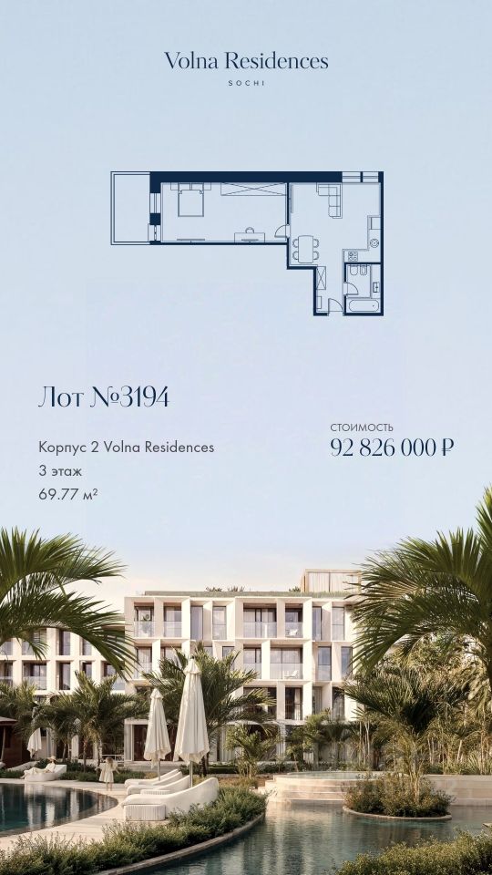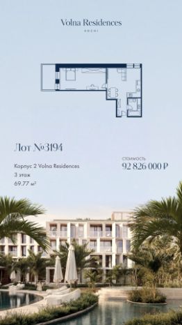 Продаётся 1-комнатная квартира в строящемся доме (Дом 2), срок сдачи: II-кв. 2028, общей площадью 69.77 кв.м., на 3 этаже. Volna Residence - это комплекс для жизни на территории комплекса Volna, объединённый с отелем общей концепцией и инфраструктурой. 3 малоэтажных корпуса на 520 номеров расположены на первой береговой линии и имеют собственный бассейн.