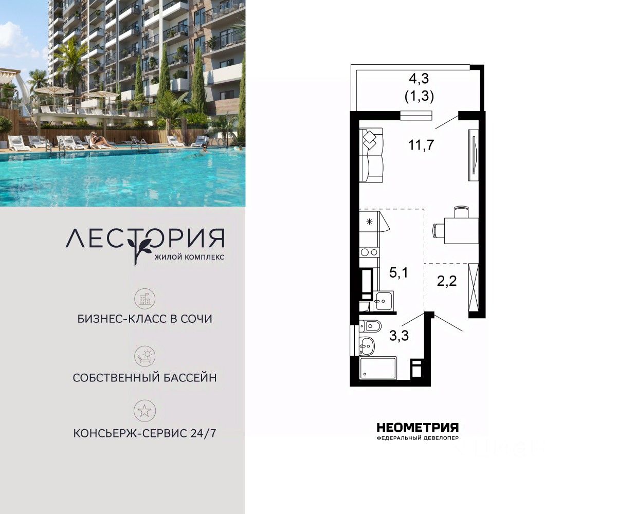 Продается квартира в жилом комплексе бизнес-класса "Лестория". В составе ЖК предусмотрена собственная аквазона площадью 473 квадратных метра с двумя подогреваемыми бассейнами, что соответствуют стандартам бизнес-класса. Аквазона объединяет взрослый и детский бассейны. В welcome-zone к услугам посетителей шезлонги и все необходимые принадлежности. Раздевалки с душевыми комнатами, инфракрасная сауна — здесь все предусмотрено для комфортного отдыха и полного расслабления. Для водного комплекса продуман отдельный вход, оборудованный системой контроля и управления доступом (СКУД). Аквазона только часть уникальной инфраструктуры "Лестории", которая включает в себя также благоустроенную территорию с пятьюдесятью функциональными зонами для прогулок, отдыха и занятий спортом, видовые террасы на крышах для отдыха, работы и встреч с друзьями, а также пространство набережной Кудепсты с шезлонгами и перголами. Жилой комплекс "Лестория" состоит из шести домов высотностью от 15 до 17 этажей, окружённых зеленым массивом национального парка. На придомовой территории для жителей предусмотрены закрытые дворы с круглосуточным видеонаблюдением, активити-центр для детей и подростков, тихие зоны для отдыха и медитации. На крышах домов будут созданы зеленые террасы для наслаждения прекрасными видами на море и горы. В проекте предусмотрены разные варианты отделки квартир под потребности покупателей. Тем, кто хочет воплотить в жизнь собственные интерьерные задумки, подойдут квартиры без ремонта. Для комфортной жизни и отдыха в комплексе будет работать круглосуточный консьерж-сервис уровня 5*, который с легкостью закроет все ежедневные потребности: от заказа продуктов и встречи гостей в аэропорту до выгула и дрессировки питомца. К услугам жителей ЖК "Лестория" — собственная управляющая компания, для инвесторов предоставляются услуги доверительного управления.