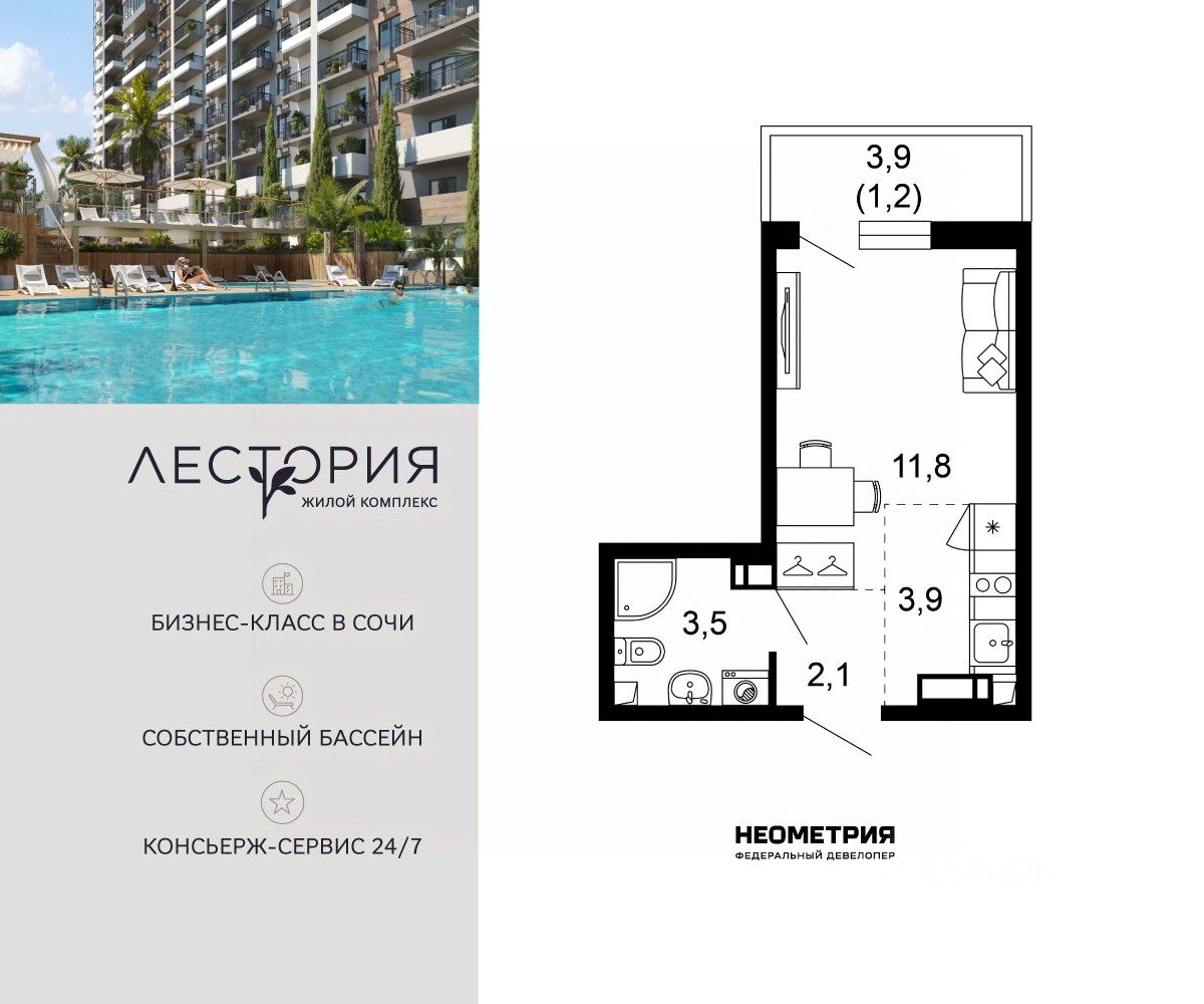 Продается квартира в жилом комплексе бизнес-класса "Лестория". В составе ЖК предусмотрена собственная аквазона площадью 473 квадратных метра с двумя подогреваемыми бассейнами, что соответствуют стандартам бизнес-класса. Аквазона объединяет взрослый и детский бассейны. В welcome-zone к услугам посетителей шезлонги и все необходимые принадлежности. Раздевалки с душевыми комнатами, инфракрасная сауна — здесь все предусмотрено для комфортного отдыха и полного расслабления. Для водного комплекса продуман отдельный вход, оборудованный системой контроля и управления доступом (СКУД). Аквазона только часть уникальной инфраструктуры "Лестории", которая включает в себя также благоустроенную территорию с пятьюдесятью функциональными зонами для прогулок, отдыха и занятий спортом, видовые террасы на крышах для отдыха, работы и встреч с друзьями, а также пространство набережной Кудепсты с шезлонгами и перголами. Жилой комплекс "Лестория" состоит из шести домов высотностью от 15 до 17 этажей, окружённых зеленым массивом национального парка. На придомовой территории для жителей предусмотрены закрытые дворы с круглосуточным видеонаблюдением, активити-центр для детей и подростков, тихие зоны для отдыха и медитации. На крышах домов будут созданы зеленые террасы для наслаждения прекрасными видами на море и горы. В проекте предусмотрены разные варианты отделки квартир под потребности покупателей. Тем, кто хочет воплотить в жизнь собственные интерьерные задумки, подойдут квартиры без ремонта. Для комфортной жизни и отдыха в комплексе будет работать круглосуточный консьерж-сервис уровня 5*, который с легкостью закроет все ежедневные потребности: от заказа продуктов и встречи гостей в аэропорту до выгула и дрессировки питомца. К услугам жителей ЖК "Лестория" — собственная управляющая компания, для инвесторов предоставляются услуги доверительного управления.