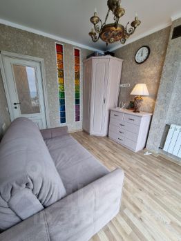 Квартира-"Пицца". Очень уютная,с хорошим ремонтом,с эксклюзивными итальянскими хрустальными люстрами Brasline из латуни(в гостиной и кухне) и керамической люстрой и двумя бра Brasline в стиле барокко с аллегорическими фигурами по картине итальянского художника Пьетро да Кортона " Палаццо Питти во Флоренции" (в спальне) и в коридоре потолочная люстра из бронзы и латуни фирмы Brasline.Все точечные светильники из бронзы этого же итальянского производителя Brasline(кроме светильников в ванной комнате). Смесители, душевая система и душевой уголок итальянской фирмы Cezares.