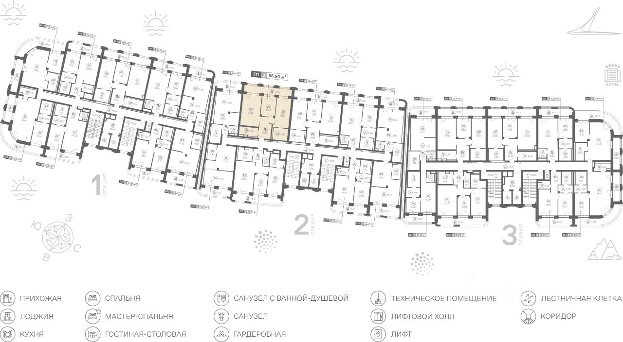 Трехкомнатная резиденция с кухней-гостиной и балконом, а также двумя санузлами Из окон открывается вид во внутренний двор, на бассейны, парки. Высота потолков составляет 3,1 метра. Отделка под ключ.