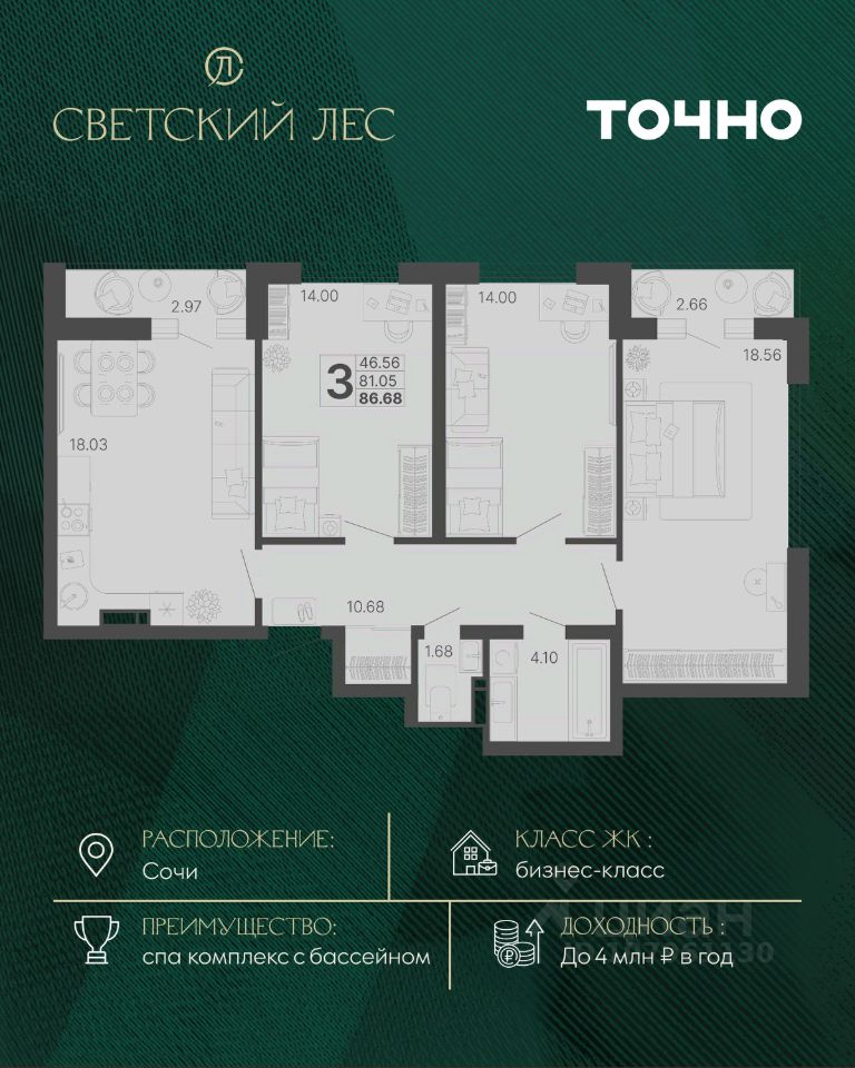 Светский лес - эксклюзивный жилой проект бизнес-класса в Сочи. Это остров цивилизации и технологий в окружении дикой природы национального парка с богатой инфраструктурой, наполненной различными сценариями премиального отдыха и жизни. Общественное пространство ЖК включает в себя прогулочные зоны, СПА комплекс с круглогодичным бассейном, детские и спортивные площадки, велодорожки, собственную набережную реки Сочи, торговую галерею с супермаркетами и ресторанами, а также инновационную школу и детский сад.
