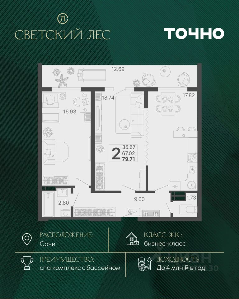 ЖК "Светский лес" — эксклюзивный жилой проект бизнес-класса в Сочи. Это остров цивилизации и технологий в окружении дикой природы национального парка с богатой инфраструктурой, наполненной различными сценариями премиального отдыха и жизни. Общественное пространство жилого комплекса включает в себя прогулочные зоны, спа-комплекс с круглогодичным бассейном, детские и спортивные площадки, велодорожки, собственную набережную реки Сочи, торговую галерею с супермаркетами и ресторанами, а также инновационную школу на 1510 мест и детский сад на 510 мест. Квартира в ЖК "Светский лес" — идеальный вариант как для жизни у моря, так и для инвестиций. Удобный сервис доверительного управления позволит легко зарабатывать на недвижимости в ЖК "Светский лес" до 4 млн. руб. в год.*