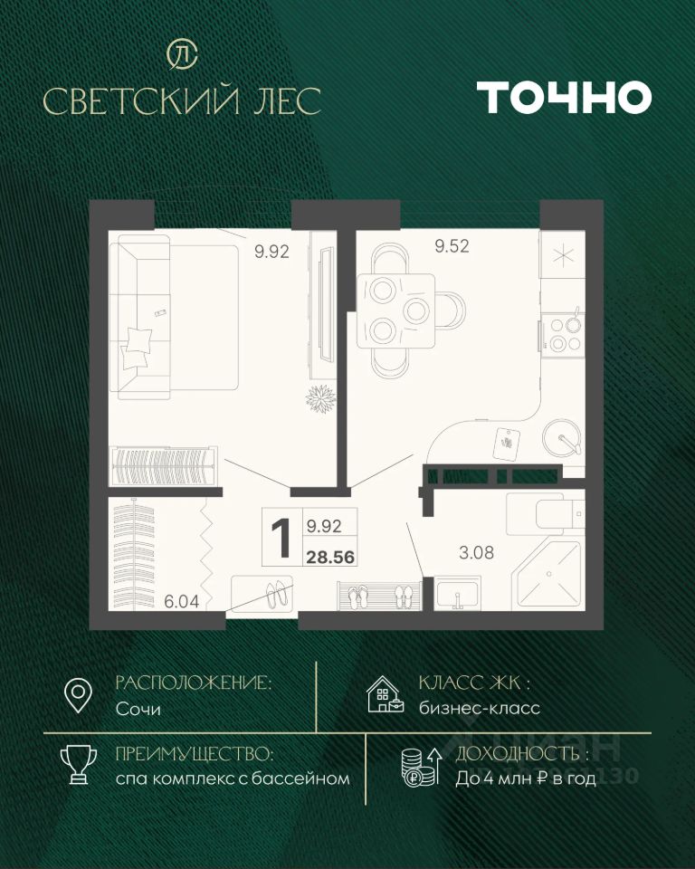 ЖК "Светский лес" — эксклюзивный жилой проект бизнес-класса в Сочи. Это остров цивилизации и технологий в окружении дикой природы национального парка с богатой инфраструктурой, наполненной различными сценариями премиального отдыха и жизни. Общественное пространство жилого комплекса включает в себя прогулочные зоны, спа-комплекс с круглогодичным бассейном, детские и спортивные площадки, велодорожки, собственную набережную реки Сочи, торговую галерею с супермаркетами и ресторанами, а также инновационную школу на 1510 мест и детский сад на 510 мест. Квартира в ЖК "Светский лес" — идеальный вариант как для жизни у моря, так и для инвестиций. Удобный сервис доверительного управления позволит легко зарабатывать на недвижимости в ЖК "Светский лес" до 4 млн. руб. в год.*