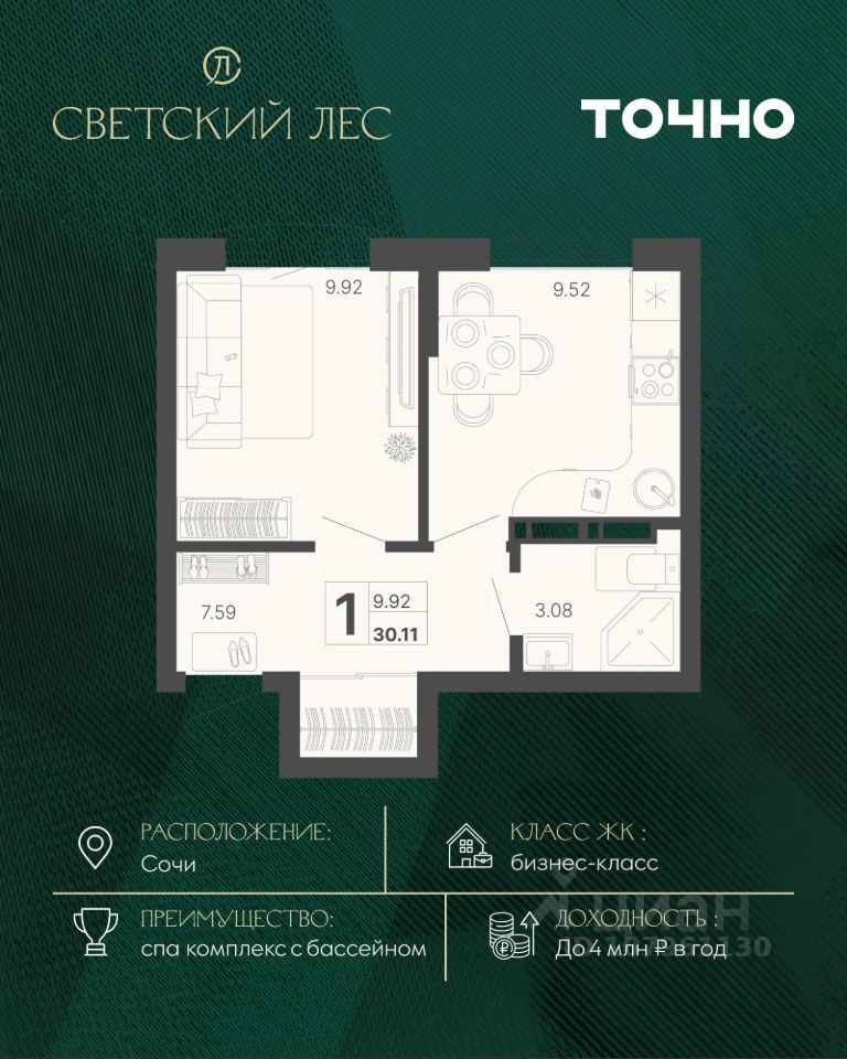 ЖК "Светский лес" — эксклюзивный жилой проект бизнес-класса в Сочи. Это остров цивилизации и технологий в окружении дикой природы национального парка с богатой инфраструктурой, наполненной различными сценариями премиального отдыха и жизни. Общественное пространство жилого комплекса включает в себя прогулочные зоны, спа-комплекс с круглогодичным бассейном, детские и спортивные площадки, велодорожки, собственную набережную реки Сочи, торговую галерею с супермаркетами и ресторанами, а также инновационную школу на 1510 мест и детский сад на 510 мест. Квартира в ЖК "Светский лес" — идеальный вариант как для жизни у моря, так и для инвестиций. Удобный сервис доверительного управления позволит легко зарабатывать на недвижимости в ЖК "Светский лес" до 4 млн. руб. в год.*