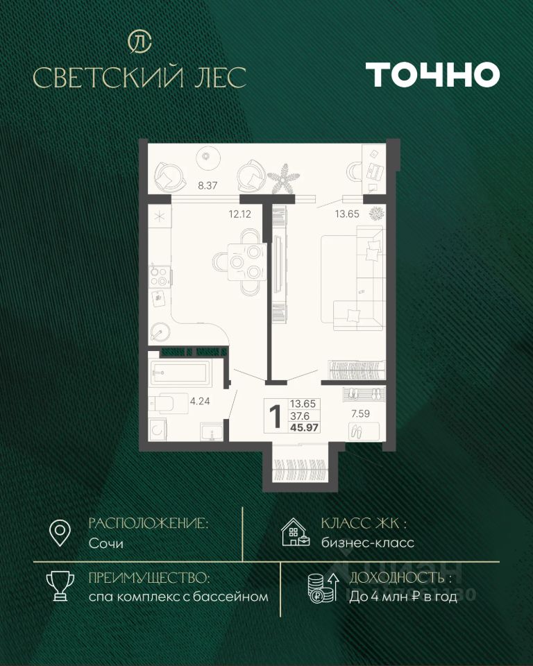 ЖК "Светский лес" — эксклюзивный жилой проект бизнес-класса в Сочи. Это остров цивилизации и технологий в окружении дикой природы национального парка с богатой инфраструктурой, наполненной различными сценариями премиального отдыха и жизни. Общественное пространство жилого комплекса включает в себя прогулочные зоны, спа-комплекс с круглогодичным бассейном, детские и спортивные площадки, велодорожки, собственную набережную реки Сочи, торговую галерею с супермаркетами и ресторанами, а также инновационную школу на 1510 мест и детский сад на 510 мест. Квартира в ЖК "Светский лес" — идеальный вариант как для жизни у моря, так и для инвестиций. Удобный сервис доверительного управления позволит легко зарабатывать на недвижимости в ЖК "Светский лес" до 4 млн. руб. в год.*