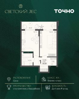ЖК "Светский лес" — эксклюзивный жилой проект бизнес-класса в Сочи. Это остров цивилизации и технологий в окружении дикой природы национального парка с богатой инфраструктурой, наполненной различными сценариями премиального отдыха и жизни. Общественное пространство жилого комплекса включает в себя прогулочные зоны, спа-комплекс с круглогодичным бассейном, детские и спортивные площадки, велодорожки, собственную набережную реки Сочи, торговую галерею с супермаркетами и ресторанами, а также инновационную школу на 1510 мест и детский сад на 510 мест. Квартира в ЖК "Светский лес" — идеальный вариант как для жизни у моря, так и для инвестиций. Удобный сервис доверительного управления позволит легко зарабатывать на недвижимости в ЖК "Светский лес" до 4 млн. руб. в год.*