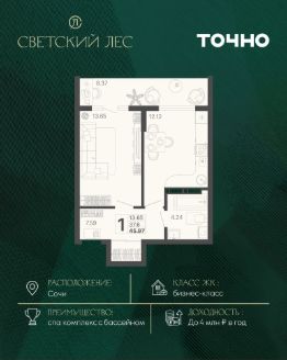 ЖК "Светский лес" — эксклюзивный жилой проект бизнес-класса в Сочи. Это остров цивилизации и технологий в окружении дикой природы национального парка с богатой инфраструктурой, наполненной различными сценариями премиального отдыха и жизни. Общественное пространство жилого комплекса включает в себя прогулочные зоны, спа-комплекс с круглогодичным бассейном, детские и спортивные площадки, велодорожки, собственную набережную реки Сочи, торговую галерею с супермаркетами и ресторанами, а также инновационную школу на 1510 мест и детский сад на 510 мест. Квартира в ЖК "Светский лес" — идеальный вариант как для жизни у моря, так и для инвестиций. Удобный сервис доверительного управления позволит легко зарабатывать на недвижимости в ЖК "Светский лес" до 4 млн. руб. в год.*