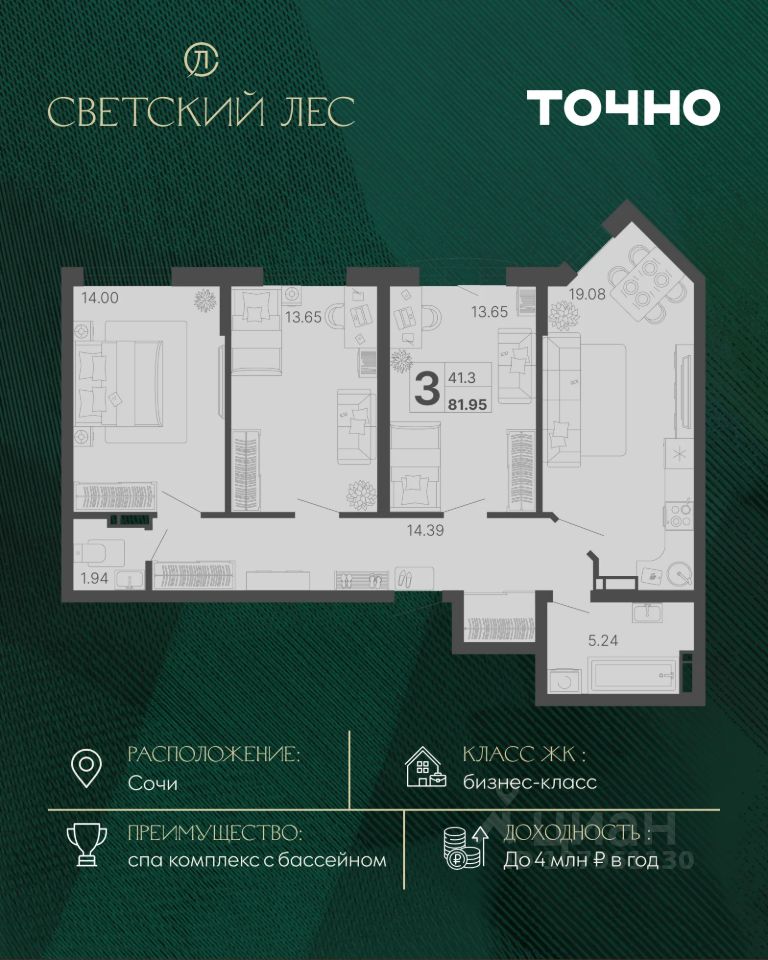 ЖК "Светский лес" — эксклюзивный жилой проект бизнес-класса в Сочи. Это остров цивилизации и технологий в окружении дикой природы национального парка с богатой инфраструктурой, наполненной различными сценариями премиального отдыха и жизни. Общественное пространство жилого комплекса включает в себя прогулочные зоны, спа-комплекс с круглогодичным бассейном, детские и спортивные площадки, велодорожки, собственную набережную реки Сочи, торговую галерею с супермаркетами и ресторанами, а также инновационную школу на 1510 мест и детский сад на 510 мест. Квартира в ЖК "Светский лес" — идеальный вариант как для жизни у моря, так и для инвестиций. Удобный сервис доверительного управления позволит легко зарабатывать на недвижимости в ЖК "Светский лес" до 4 млн. руб. в год.*