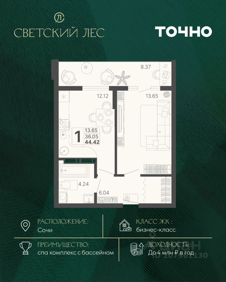 ЖК "Светский лес" — эксклюзивный жилой проект бизнес-класса в Сочи. Это остров цивилизации и технологий в окружении дикой природы национального парка с богатой инфраструктурой, наполненной различными сценариями премиального отдыха и жизни. Общественное пространство жилого комплекса включает в себя прогулочные зоны, спа-комплекс с круглогодичным бассейном, детские и спортивные площадки, велодорожки, собственную набережную реки Сочи, торговую галерею с супермаркетами и ресторанами, а также инновационную школу на 1510 мест и детский сад на 510 мест. Квартира в ЖК "Светский лес" — идеальный вариант как для жизни у моря, так и для инвестиций. Удобный сервис доверительного управления позволит легко зарабатывать на недвижимости в ЖК "Светский лес" до 4 млн. руб. в год.*