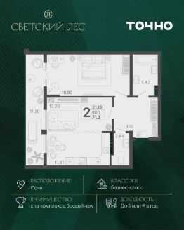 ЖК "Светский лес" — эксклюзивный жилой проект бизнес-класса в Сочи. Это остров цивилизации и технологий в окружении дикой природы национального парка с богатой инфраструктурой, наполненной различными сценариями премиального отдыха и жизни. Общественное пространство жилого комплекса включает в себя прогулочные зоны, спа-комплекс с круглогодичным бассейном, детские и спортивные площадки, велодорожки, собственную набережную реки Сочи, торговую галерею с супермаркетами и ресторанами, а также инновационную школу на 1510 мест и детский сад на 510 мест. Квартира в ЖК "Светский лес" — идеальный вариант как для жизни у моря, так и для инвестиций. Удобный сервис доверительного управления позволит легко зарабатывать на недвижимости в ЖК "Светский лес" до 4 млн. руб. в год.*