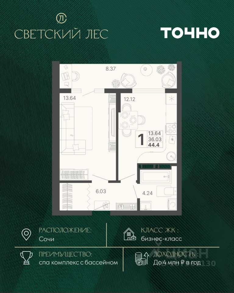 ЖК "Светский лес" — эксклюзивный жилой проект бизнес-класса в Сочи. Это остров цивилизации и технологий в окружении дикой природы национального парка с богатой инфраструктурой, наполненной различными сценариями премиального отдыха и жизни. Общественное пространство жилого комплекса включает в себя прогулочные зоны, спа-комплекс с круглогодичным бассейном, детские и спортивные площадки, велодорожки, собственную набережную реки Сочи, торговую галерею с супермаркетами и ресторанами, а также инновационную школу на 1510 мест и детский сад на 510 мест. Квартира в ЖК "Светский лес" — идеальный вариант как для жизни у моря, так и для инвестиций. Удобный сервис доверительного управления позволит легко зарабатывать на недвижимости в ЖК "Светский лес" до 4 млн. руб. в год.*