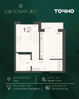 ЖК "Светский лес" — эксклюзивный жилой проект бизнес-класса в Сочи. Это остров цивилизации и технологий в окружении дикой природы национального парка с богатой инфраструктурой, наполненной различными сценариями премиального отдыха и жизни. Общественное пространство жилого комплекса включает в себя прогулочные зоны, спа-комплекс с круглогодичным бассейном, детские и спортивные площадки, велодорожки, собственную набережную реки Сочи, торговую галерею с супермаркетами и ресторанами, а также инновационную школу на 1510 мест и детский сад на 510 мест. Квартира в ЖК "Светский лес" — идеальный вариант как для жизни у моря, так и для инвестиций. Удобный сервис доверительного управления позволит легко зарабатывать на недвижимости в ЖК "Светский лес" до 4 млн. руб. в год.*