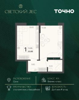 ЖК "Светский лес" — эксклюзивный жилой проект бизнес-класса в Сочи. Это остров цивилизации и технологий в окружении дикой природы национального парка с богатой инфраструктурой, наполненной различными сценариями премиального отдыха и жизни. Общественное пространство жилого комплекса включает в себя прогулочные зоны, спа-комплекс с круглогодичным бассейном, детские и спортивные площадки, велодорожки, собственную набережную реки Сочи, торговую галерею с супермаркетами и ресторанами, а также инновационную школу на 1510 мест и детский сад на 510 мест. Квартира в ЖК "Светский лес" — идеальный вариант как для жизни у моря, так и для инвестиций. Удобный сервис доверительного управления позволит легко зарабатывать на недвижимости в ЖК "Светский лес" до 4 млн. руб. в год.*