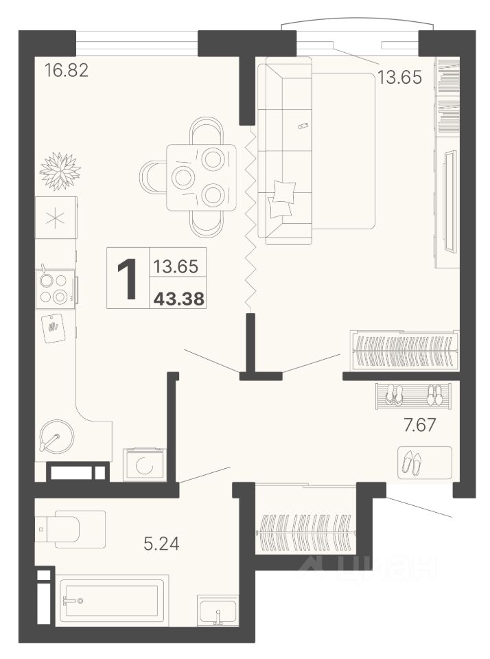 Общая площадь43,38 м²