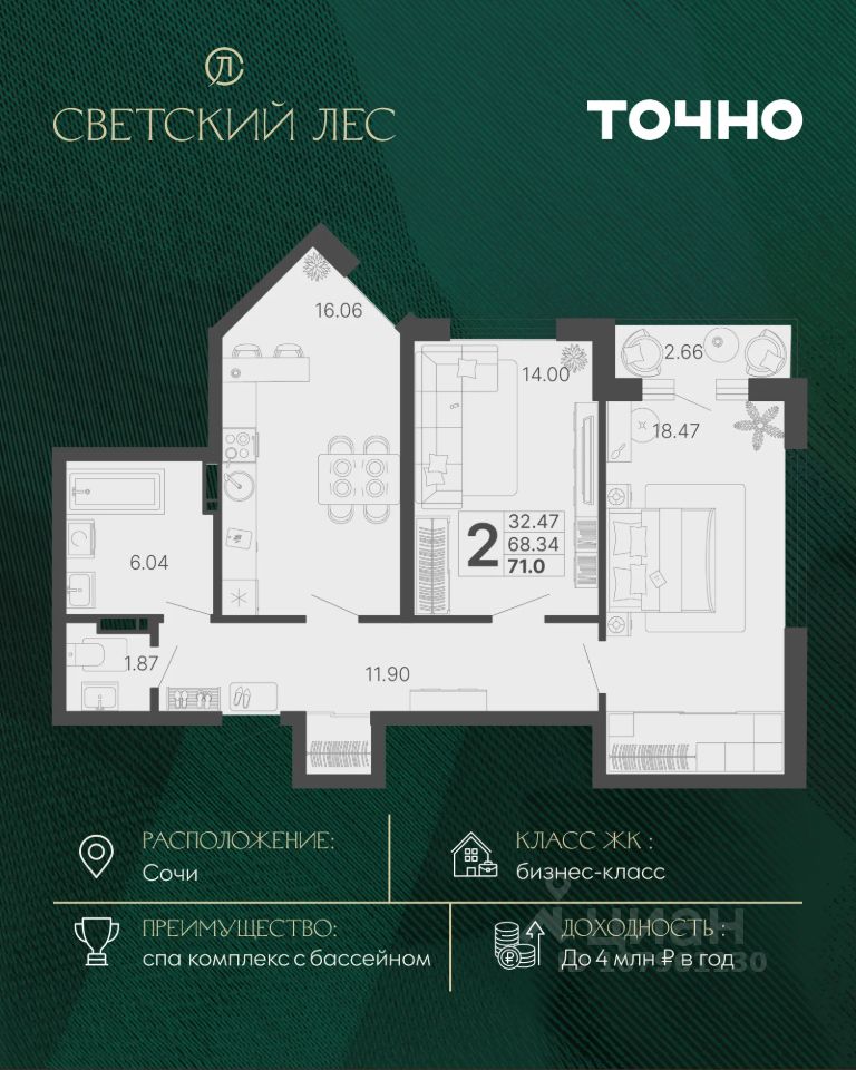 ЖК "Светский лес" — эксклюзивный жилой проект бизнес-класса в Сочи. Это остров цивилизации и технологий в окружении дикой природы национального парка с богатой инфраструктурой, наполненной различными сценариями премиального отдыха и жизни. Общественное пространство жилого комплекса включает в себя прогулочные зоны, спа-комплекс с круглогодичным бассейном, детские и спортивные площадки, велодорожки, собственную набережную реки Сочи, торговую галерею с супермаркетами и ресторанами, а также инновационную школу на 1510 мест и детский сад на 510 мест. Квартира в ЖК "Светский лес" — идеальный вариант как для жизни у моря, так и для инвестиций. Удобный сервис доверительного управления позволит легко зарабатывать на недвижимости в ЖК "Светский лес" до 4 млн. руб. в год.*