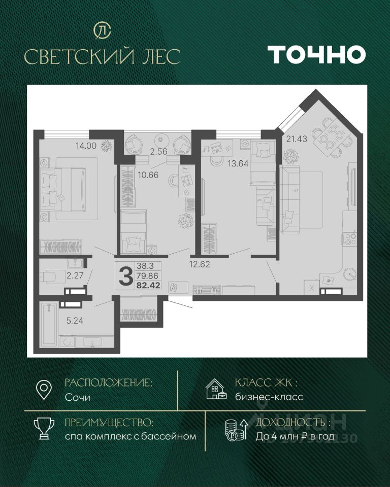 Светский лес - эксклюзивный жилой проект бизнес-класса в Сочи. Это остров цивилизации и технологий в окружении дикой природы национального парка с богатой инфраструктурой, наполненной различными сценариями премиального отдыха и жизни. Общественное пространство ЖК включает в себя прогулочные зоны, СПА комплекс с круглогодичным бассейном, детские и спортивные площадки, велодорожки, собственную набережную реки Сочи, торговую галерею с супермаркетами и ресторанами, а также инновационную школу и детский сад.