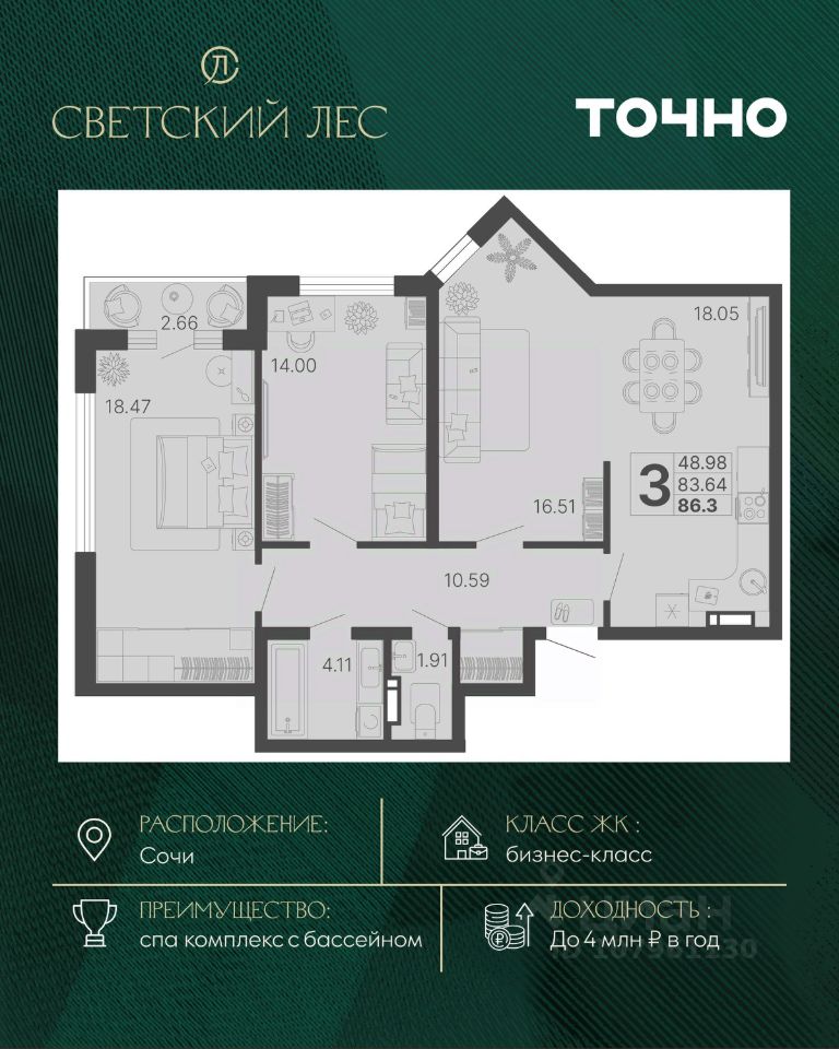 Светский лес - эксклюзивный жилой проект бизнес-класса в Сочи. Это остров цивилизации и технологий в окружении дикой природы национального парка с богатой инфраструктурой, наполненной различными сценариями премиального отдыха и жизни. Общественное пространство ЖК включает в себя прогулочные зоны, СПА комплекс с круглогодичным бассейном, детские и спортивные площадки, велодорожки, собственную набережную реки Сочи, торговую галерею с супермаркетами и ресторанами, а также инновационную школу и детский сад.