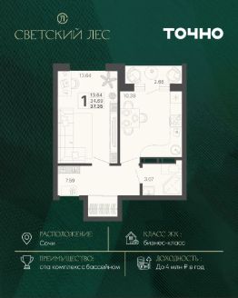 ЖК "Светский лес" — эксклюзивный жилой проект бизнес-класса в Сочи. Это остров цивилизации и технологий в окружении дикой природы национального парка с богатой инфраструктурой, наполненной различными сценариями премиального отдыха и жизни. Общественное пространство жилого комплекса включает в себя прогулочные зоны, спа-комплекс с круглогодичным бассейном, детские и спортивные площадки, велодорожки, собственную набережную реки Сочи, торговую галерею с супермаркетами и ресторанами, а также инновационную школу на 1510 мест и детский сад на 510 мест. Квартира в ЖК "Светский лес" — идеальный вариант как для жизни у моря, так и для инвестиций. Удобный сервис доверительного управления позволит легко зарабатывать на недвижимости в ЖК "Светский лес" до 4 млн. руб. в год.*