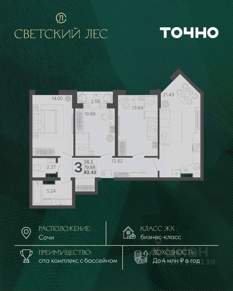 Светский лес - эксклюзивный жилой проект бизнес-класса в Сочи. Это остров цивилизации и технологий в окружении дикой природы национального парка с богатой инфраструктурой, наполненной различными сценариями премиального отдыха и жизни. Общественное пространство ЖК включает в себя прогулочные зоны, СПА комплекс с круглогодичным бассейном, детские и спортивные площадки, велодорожки, собственную набережную реки Сочи, торговую галерею с супермаркетами и ресторанами, а также инновационную школу и детский сад.
