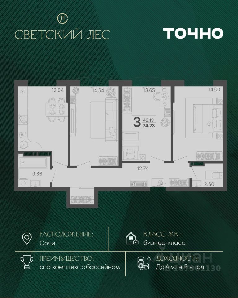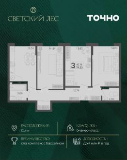 ЖК "Светский лес" — эксклюзивный жилой проект бизнес-класса в Сочи. Это остров цивилизации и технологий в окружении дикой природы национального парка с богатой инфраструктурой, наполненной различными сценариями премиального отдыха и жизни. Общественное пространство жилого комплекса включает в себя прогулочные зоны, спа-комплекс с круглогодичным бассейном, детские и спортивные площадки, велодорожки, собственную набережную реки Сочи, торговую галерею с супермаркетами и ресторанами, а также инновационную школу на 1510 мест и детский сад на 510 мест. Квартира в ЖК "Светский лес" — идеальный вариант как для жизни у моря, так и для инвестиций. Удобный сервис доверительного управления позволит легко зарабатывать на недвижимости в ЖК "Светский лес" до 4 млн. руб. в год.*
