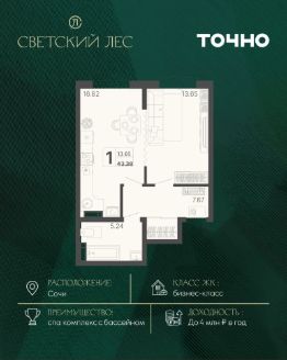 ЖК "Светский лес" — эксклюзивный жилой проект бизнес-класса в Сочи. Это остров цивилизации и технологий в окружении дикой природы национального парка с богатой инфраструктурой, наполненной различными сценариями премиального отдыха и жизни. Общественное пространство жилого комплекса включает в себя прогулочные зоны, спа-комплекс с круглогодичным бассейном, детские и спортивные площадки, велодорожки, собственную набережную реки Сочи, торговую галерею с супермаркетами и ресторанами, а также инновационную школу на 1510 мест и детский сад на 510 мест. Квартира в ЖК "Светский лес" — идеальный вариант как для жизни у моря, так и для инвестиций. Удобный сервис доверительного управления позволит легко зарабатывать на недвижимости в ЖК "Светский лес" до 4 млн. руб. в год.*