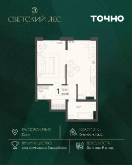 ЖК "Светский лес" — эксклюзивный жилой проект бизнес-класса в Сочи. Это остров цивилизации и технологий в окружении дикой природы национального парка с богатой инфраструктурой, наполненной различными сценариями премиального отдыха и жизни. Общественное пространство жилого комплекса включает в себя прогулочные зоны, спа-комплекс с круглогодичным бассейном, детские и спортивные площадки, велодорожки, собственную набережную реки Сочи, торговую галерею с супермаркетами и ресторанами, а также инновационную школу на 1510 мест и детский сад на 510 мест. Квартира в ЖК "Светский лес" — идеальный вариант как для жизни у моря, так и для инвестиций. Удобный сервис доверительного управления позволит легко зарабатывать на недвижимости в ЖК "Светский лес" до 4 млн. руб. в год.*