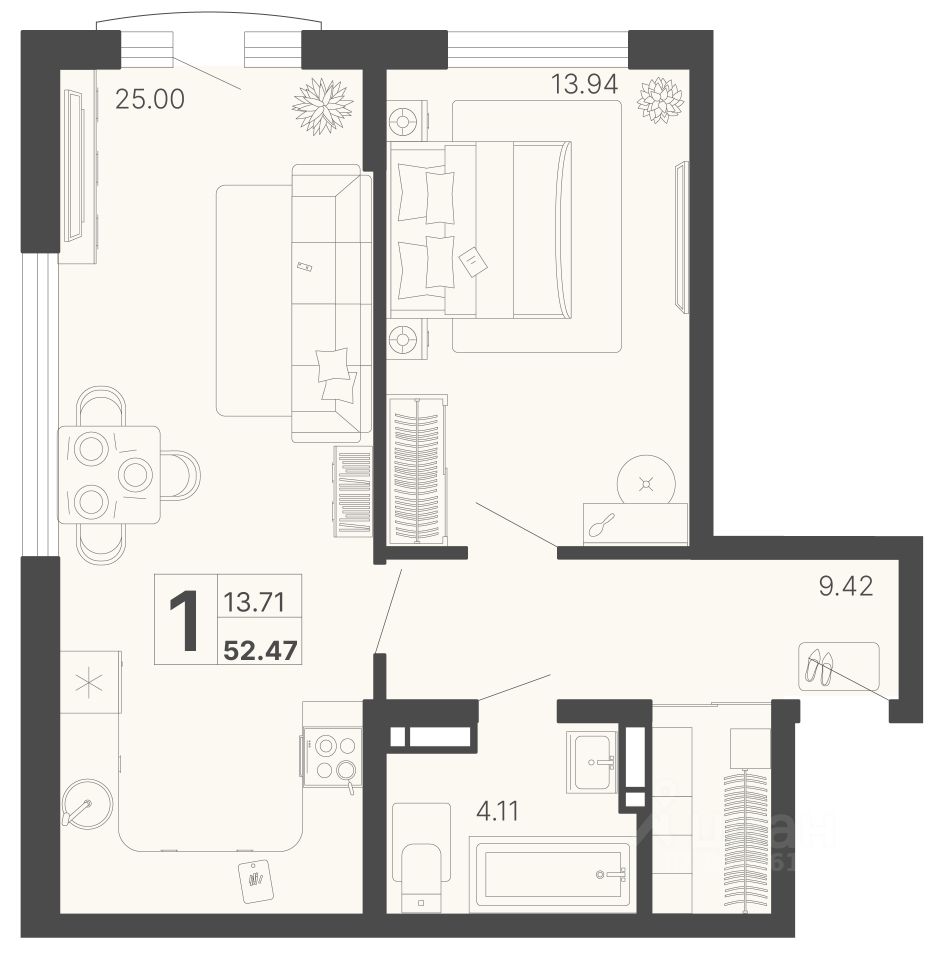 Общая площадь52,47 м²
