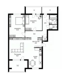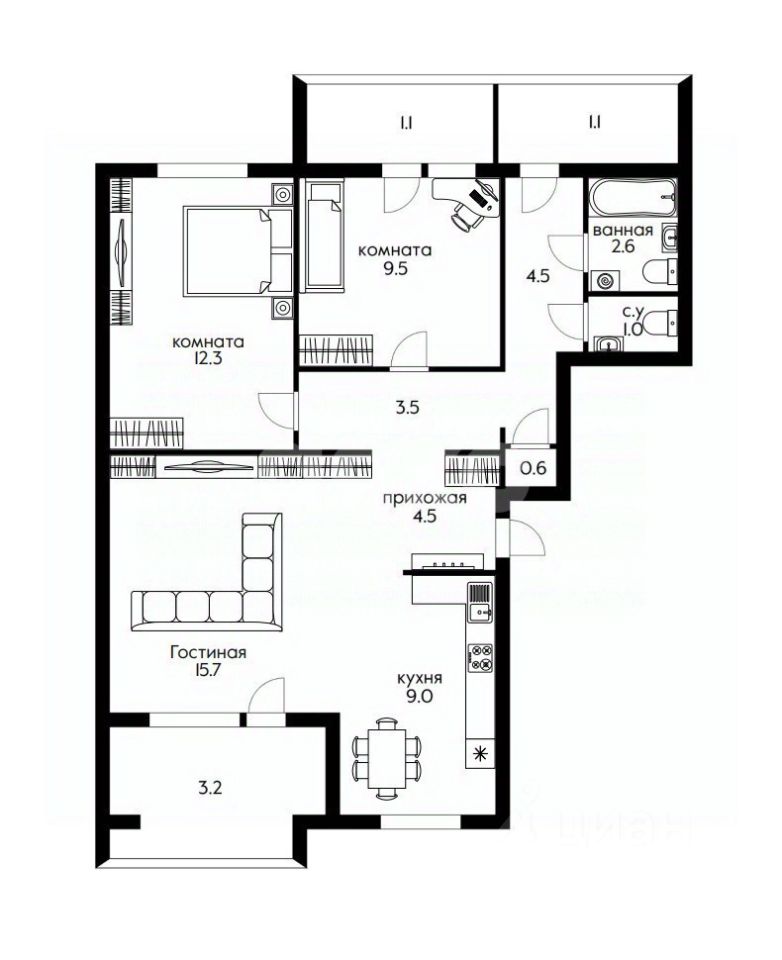 1 лоджия, 2 балкона