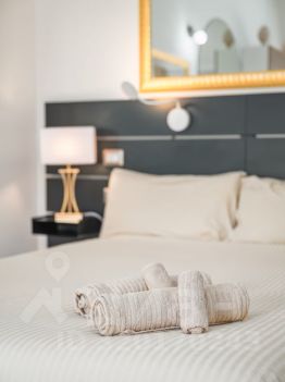 - Удобная двуспальная кровать (кровать и матрас фирмы Аскона). Спальная зона идеально сочетается с другими помещениями апартамента.
