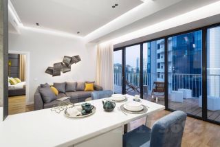 Распланирована в просторную кухню-гостиную, выделенную спальню, сан. узел, большую террасу с видом на море.