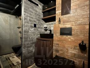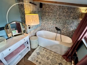 Ванная комната выполнена в современном стиле с отделкой под кирпич и камень