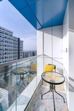 Балкон с мебелью и видом на горы.