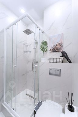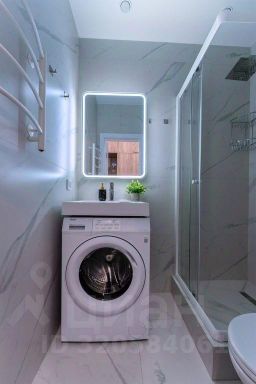 Совмещённый санузел с душем и зеркалом с подсветкой.