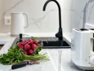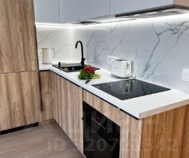 Кухня: встроенный стол, вытяжка, духовой шкаф, индукционная панель (3 конфорки), посудомойка, холодильник.