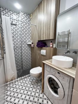 Санузел: душевая зона, инсталляция, стиральная машинка, раковина, LED-зеркало, полотенцесушитель.