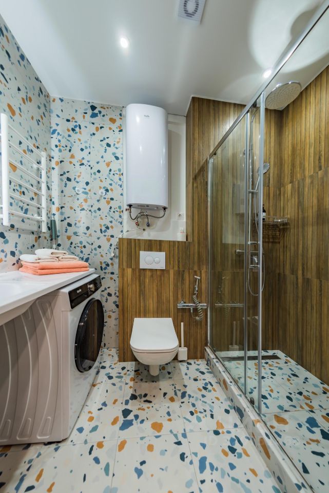 Санузел: водонагреватель,стиральная машина с функцией сушка,душевая кабина,гигиенический душ.